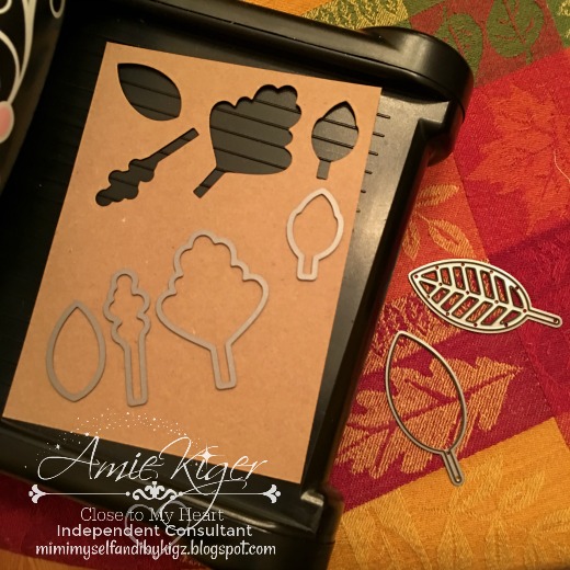 Isn't he the cutest little thing? Guess what? He is made entirely out of different leaf dies! :) I used the Falling for You Cardmaking Stamp and Thin Cut set and the Leaf Thin Cuts dies. I chose Kraft CS, Fern, Goldrush, Saffron, Peacock, and Canary CS along with the Falling for You pattern paper.